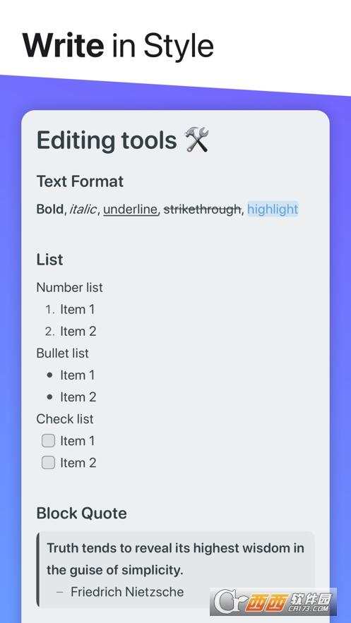 Noto笔记的特色功能包括:-人性化的工具栏—常用工具近在手边-无限添加附件(NotoPro)-图片/视频/扫描/绘图-引用/代码/公式/表格-夜间模式—在弱光环境下保护你的眼睛-待办清单—助你将文字转化为行动-多设备iCloud同步—随时随地查看-便捷手势操作—方便文章整理和文件归类-多种格式导出—适应不同的场景的格式要求HTML,PDF,&JPG